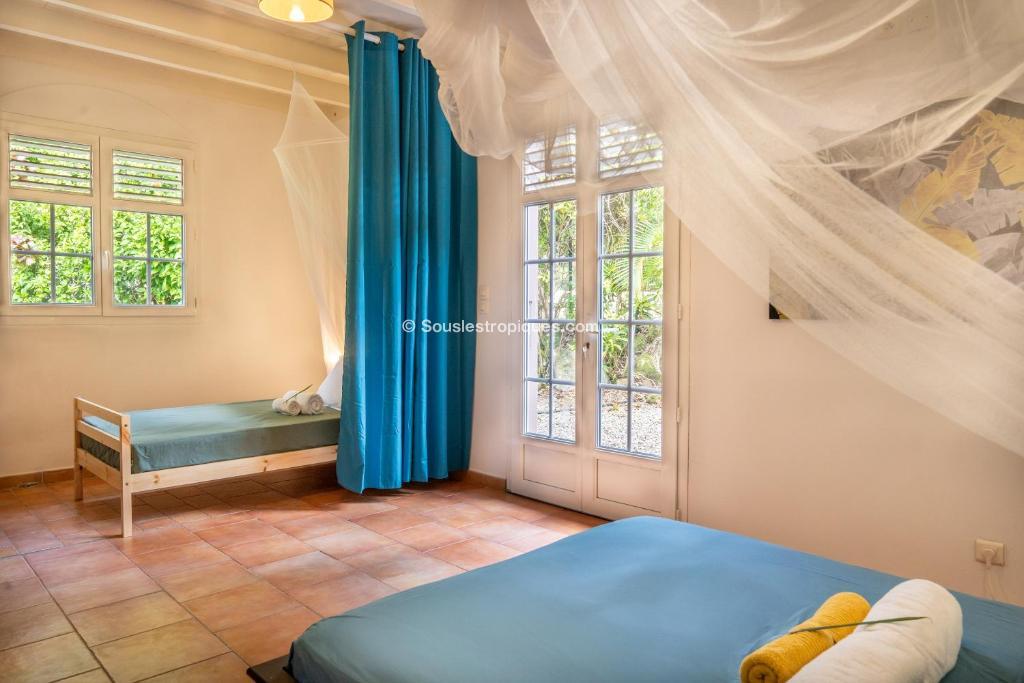 Agencement de la villa : la villa compte 3 chambres climatisées (1 lit double en 160x200 dans la chambre parentale avec vue sur la mer et la piscine, 1 lit double en 160 + 1 lit simple en 90x200 dans la seconde chambre et 1 lit double en 160x200 dans la 3ème chambre), 2 salles d'eau avec wc (dont 1 avec baignoire), salon, cuisine entièrement équipée, terrasse, piscine privée, jardin tropical et parking.