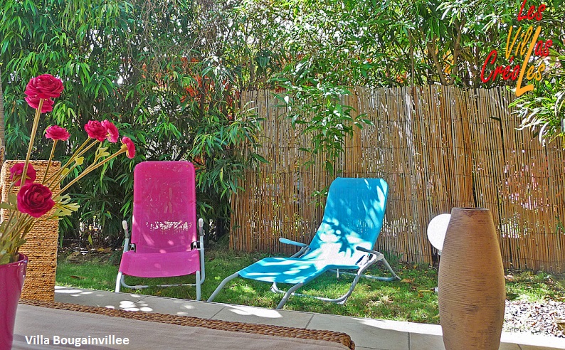 Villas Jasmin, Bougainvilliers et Alamanda pour 4 à 6 personnes : elles disposent toutes de 2 chambres climatisées (1 lit double dans la 1ère chambre et dans la 2nde chambre 1 lit simple en 90 + 1 lit superposé double en 140 en bas et simple en 90 en haut), 1 salle d'eau, cuisine équipée, séjour et terrasse privative.