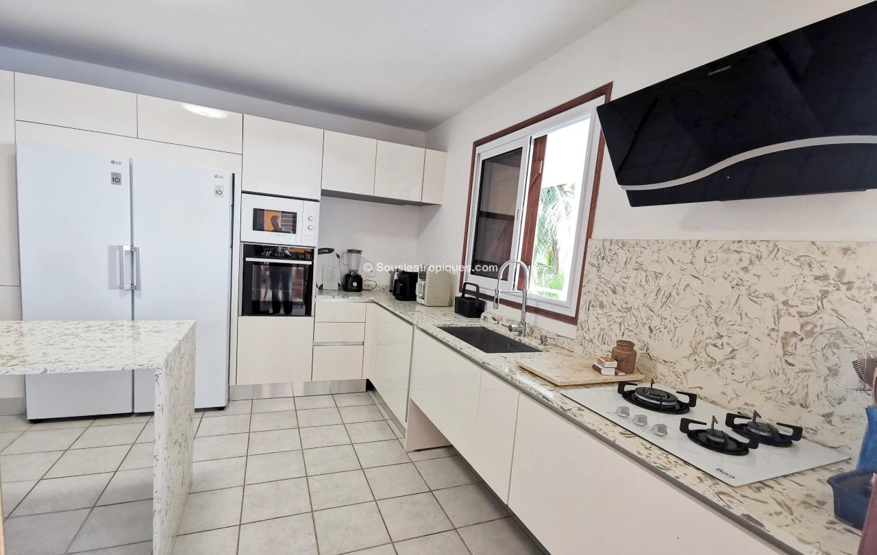 Equipements de la cuisine : cuisinière 4 feux au gaz avec hotte aspirante, réfrigérateur-congélateur, four, four micro ondes, lave vaisselle, cafetière à filtres, cafetière Nespresso, bouilloire, grille-pain, divers ustensiles de cuisine et jeu de vaisselle complet.