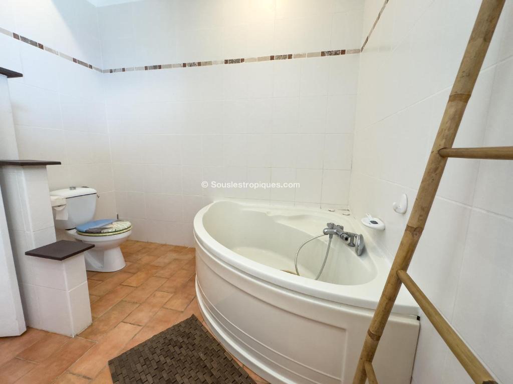 Agencement de la villa : la villa compte 3 chambres climatisées (1 lit double en 160x200 dans la chambre parentale avec vue sur la mer et la piscine, 1 lit double en 160 + 1 lit simple en 90x200 dans la seconde chambre et 1 lit double en 160x200 dans la 3ème chambre), 2 salles d'eau avec wc (dont 1 avec baignoire), salon, cuisine entièrement équipée, terrasse, piscine privée, jardin tropical et parking.